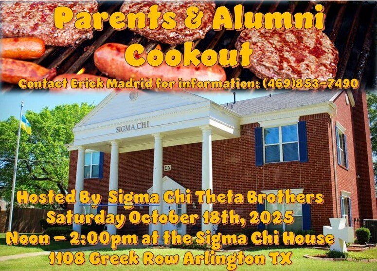 October 18, 2025Mid-Cities Sigma Chi Alumni Chapter EventsTheta Kappa Chapter House - UTAOctober 18, 2025[Mid-Cities Sigma Chi Alumni Chapter Events]Mid- Cities Alumni Chapter - UTA Parents Day Mixer MCAC / Theta Kappa membersUTA Parents / Alumni Day at the Theta Kappa Chapter house.